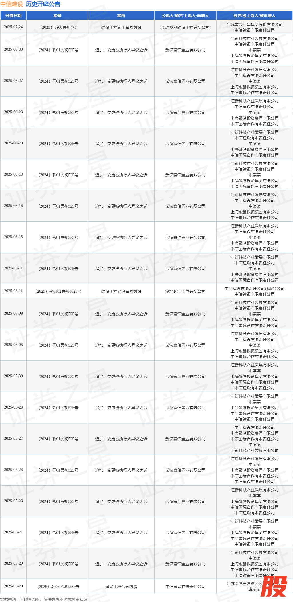 案号:(2024)鄂01民初525号审理法院:湖北省武汉市中级人民法院案由:追加、变更被执行人异议之诉当事人信息: 原告/上诉人:武汉寰信置业有限公司 被告/被上诉人:汇新科技产业发展有限公司、中信建设有限责任公司、中某某、上海聚创投资集团有限公司、中信国际合作有限责任公司开庭日期:2025年6月20日根据统计,近一年内以中信建设有限责任公司为当事人的历史开庭公告有77则,其中案由为“追加、变更被执行人异议之诉”的公告以44则居首,其次为“建设工程施工合同纠纷”有10则,“建设工程分包合同纠纷”有9则。历史开庭公告(前20条)如下: